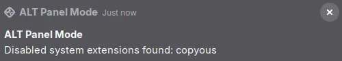 При включении этой опции при запуске alt-panelmode будет проведена проверка включения системных и дистрибутивных расширений, и при нахождении отключённых расширений уведомляет пользователя.